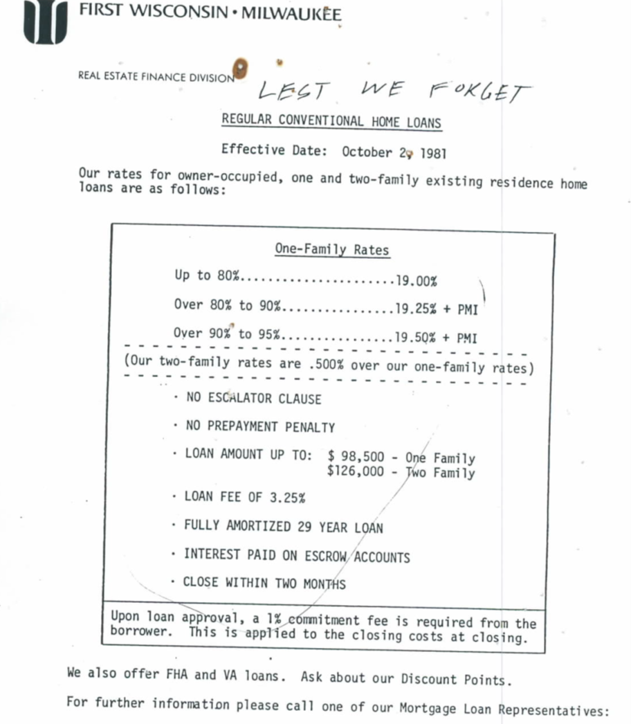 Many of us purchased our first home in the early 80’s. How can we forget the effect of rising interest rates as we secured our very first mortgage. Just to jog your memory of that very uncertain period, here is a rate sheet from the old First Wisconsin Bank: